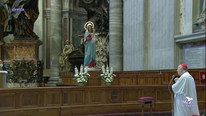 Nella grande emergenza provocata dal coronavirus, per iniziativa del cardinale Angelo Comastri, arciprete della Basilica di San Pietro, ai piedi dell’altare della Cattedra, ogni giorno alle ore 12.00, fino al 3 aprile, viene recitata la preghiera dell’Angelus seguita dal Santo Rosario e dalle litanie lauretane, per invocare l’intercessione della Madonna in questo momento così difficile.
