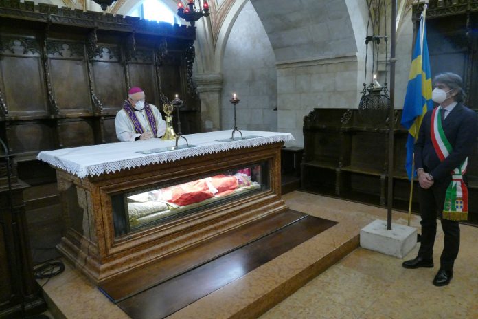 Entrambi hanno recitato un’invocazione nella quale si sono rivolti al Patrono chiedendone l’intercessione per tutti i veronesi in questa che è considerata la pandemia del secolo. Alla breve cerimonia erano inoltre presenti l’Abate Monsignor Gianni Ballarini, il quale nei giorni scorsi aveva già benedetto la città dal campanile tramite le reliquie dell’osso ioide del Santo, e il segretario particolare di sua eccellenza, don Nicola Moratello.