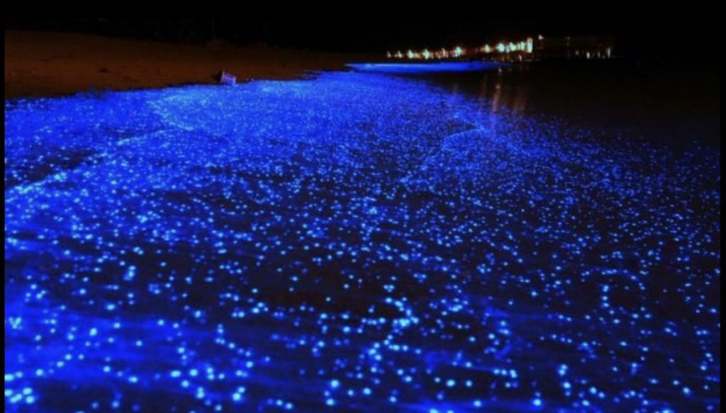 Questo fenomeno avviene a causa della bioluminescenza del fitoplancton, ovvero di particolari microrganismi che vivono in quelle acque marine e si depositano sulla sabbia. In questo modo, fanno scintillare la spiaggia con moltissime lucine blu, talmente luminose da sembrare dei led.