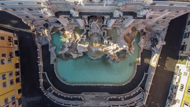 Il monumento sempre preso d’assalto dai turisti che non vedono l’ora di lanciare in acqua una moneta per esprimere un desiderio è completamente deserto.