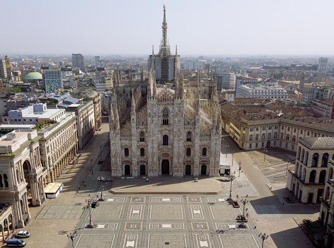 Piazza del Duomo, fulcro della metropoli, popolata solo da alcuni piccioni che camminano per la piazza. Senza le persone, i veicoli e i colori, la città appare disabitata come se nessuno ci vivesse da tempo.