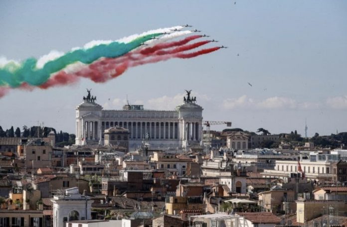 La Pattuglia acrobatica nazionale ha attraversato il cielo della Capitale italiana durante la cerimonia, che ha avuto luogo all’Altare della Patria con la presenza del Presidente della Repubblica Sergio Mattarella. Molti sono stati i cittadini (con la mascherina) che si sono radunati per assistere all’esibizione e alla cerimonia. Termina così anche il “Giro d’Italia dei cieli” iniziato il 25 maggio 2020 in segno di unità e solidarietà per l’emergenza Coronavirus.