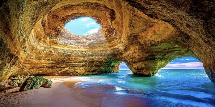 Siamo in Portogallo, a Benagil, un piccolo villaggio di pescatori che dà il nome all’affascinante grotta che si trova a 150 metri ad est dalla spiaggia e si può raggiungere in barca, in kayak o direttamente a nuoto, anche se sconsigliato poiché le maree possono raggiungere livelli pericolosi, dal momento che l’acqua sembra apparentemente calma, ma potrebbe celare al di sotto delle forti correnti.