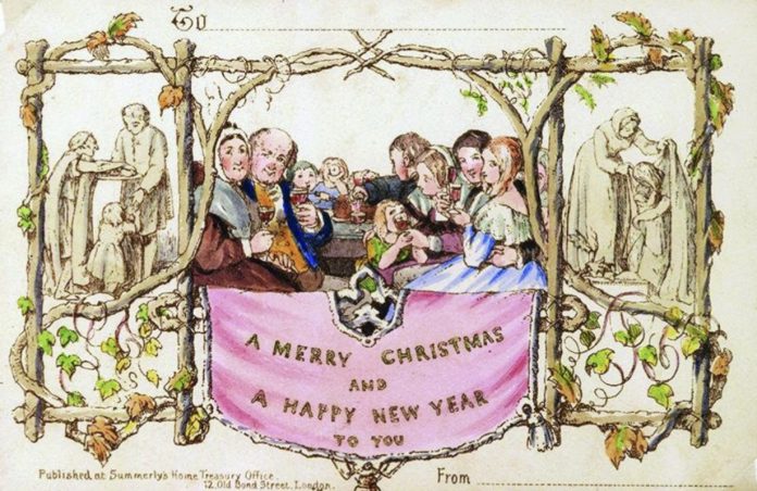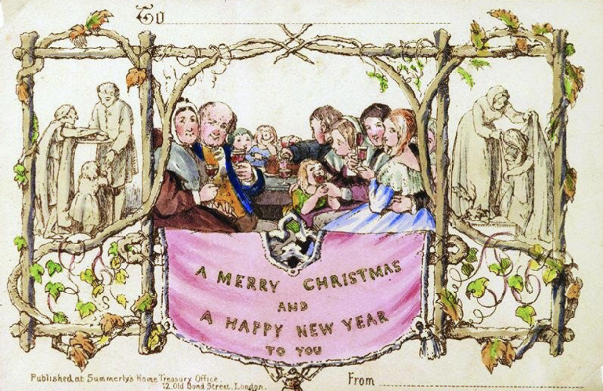 Il cartoncino che funge da biglietto di auguri risalente al 1843, quando ancora regnava la regina Vittoria, presenta la scritta «Merry Christmas and Happy New Year» ma anche un’illustrazione di John Callcott Horsley e di Joseph Cundall, la quale, tuttora, è oggetto di polemiche e controversie, in quanto raffigura una famiglia attorno ad un tavolo pronta per il pranzo di Natale e si nota che un adulto porge un bicchiere di vino ad una bambina, oltre ad una coppia abbracciata in modo forse troppo «esplicito» per l’epoca e che provocò discussioni e la nascita di campagne volte a censurare queste creazioni, infatti, la produzione stessa di queste cartoline si interruppe per ben tre anni.