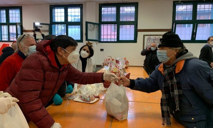 Insieme al cantante c’erano anche l’Arcivescovo di Bologna e Alessandro Bergonzoni, comico e attore italiano, che con entusiasmo hanno consegnato pasti caldi alle persone meno fortunate, specie in un periodo così particolare.