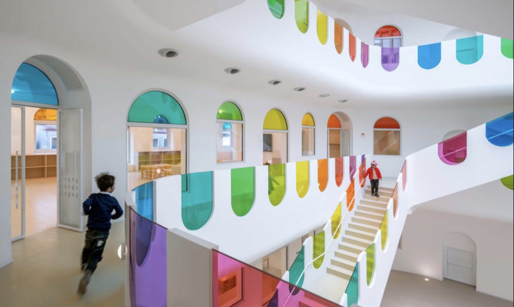 Fondamentalmente si tratta di un luogo quasi fiabesco che permette ai più piccoli di giocare con l’immaginazione ed ammirare tutti i colori dell’arcobaleno che rivestono il loro asilo.