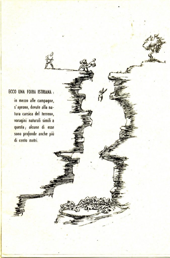 Le uccisioni avvenivano in maniera spaventosamente cruenta. Le persone erano ammassate presso le foibe e legate una all’altra con filo di ferro. Si sparava solo al primo della fila, che, caduto nella cavità carsica, si trascinava dietro tutti gli altri. Molti non morivano sul colpo; la caduta poteva essere attutita da chi precipitava prima o la profondità della foiba poteva non essere sufficiente per infliggere il colpo fatale; testimonianze di contadini, che sentivano le grida di dolore degli infoibati, ci rivelano come l’agonia poteva durare anche giorni.