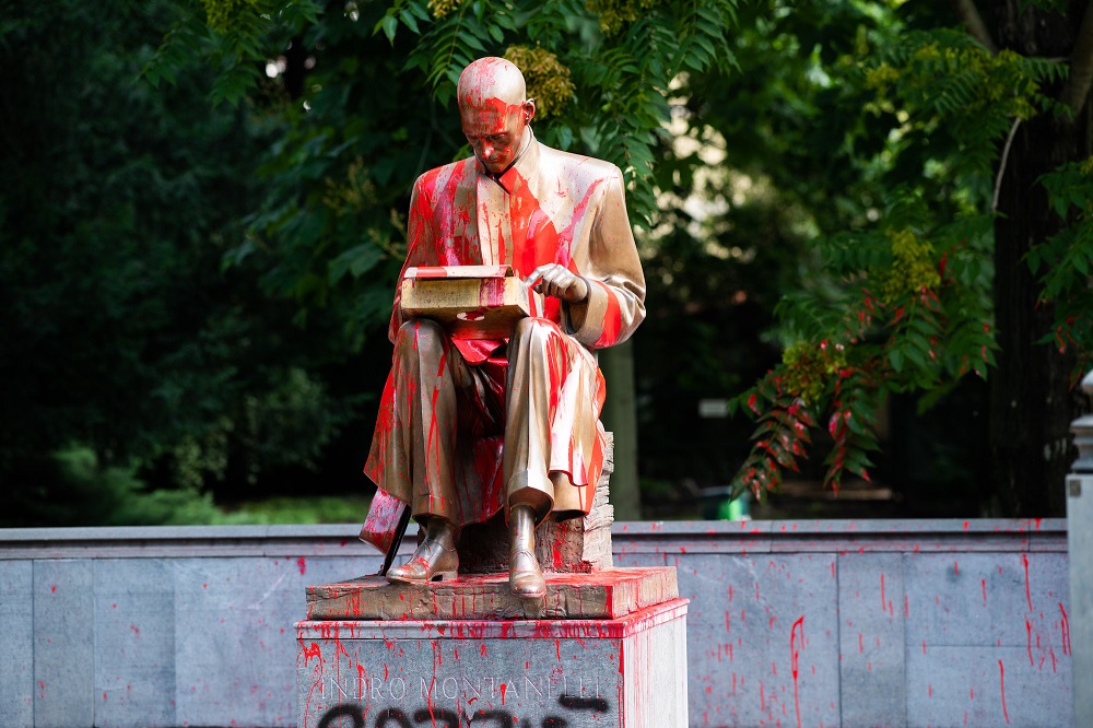 Milano, statua in memoria del luogo dell’attentato al giornalista Idro Montanelli dopo essere stata imbrattata con la vernice rossa
