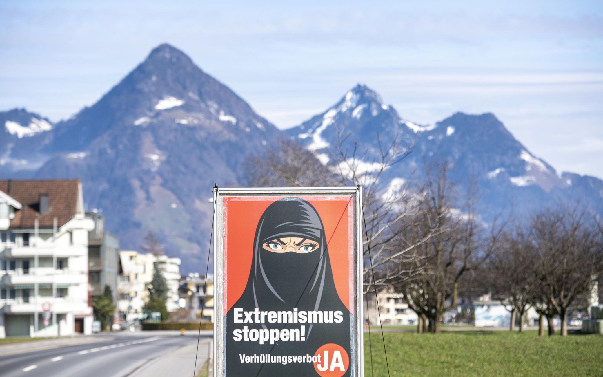 epa09056928 (FILE) - A poster of the initiative 'Yes to the burqa-ban' is seen in Oberdorf, in the canton of Nidwalden, Switzerland, 16 February 2021 (reissued 06 March 2021). Swiss citizens are called on Sunday 7 March to vote on a proposal to prohibit the concealment of one's face in the public space. Led by right-wing groups, the so-called 'anti-burqa' initiative provides for a ban on the wearing of the niqab, as well as other non-religious forms of face concealment. EPA/URS FLUEELER