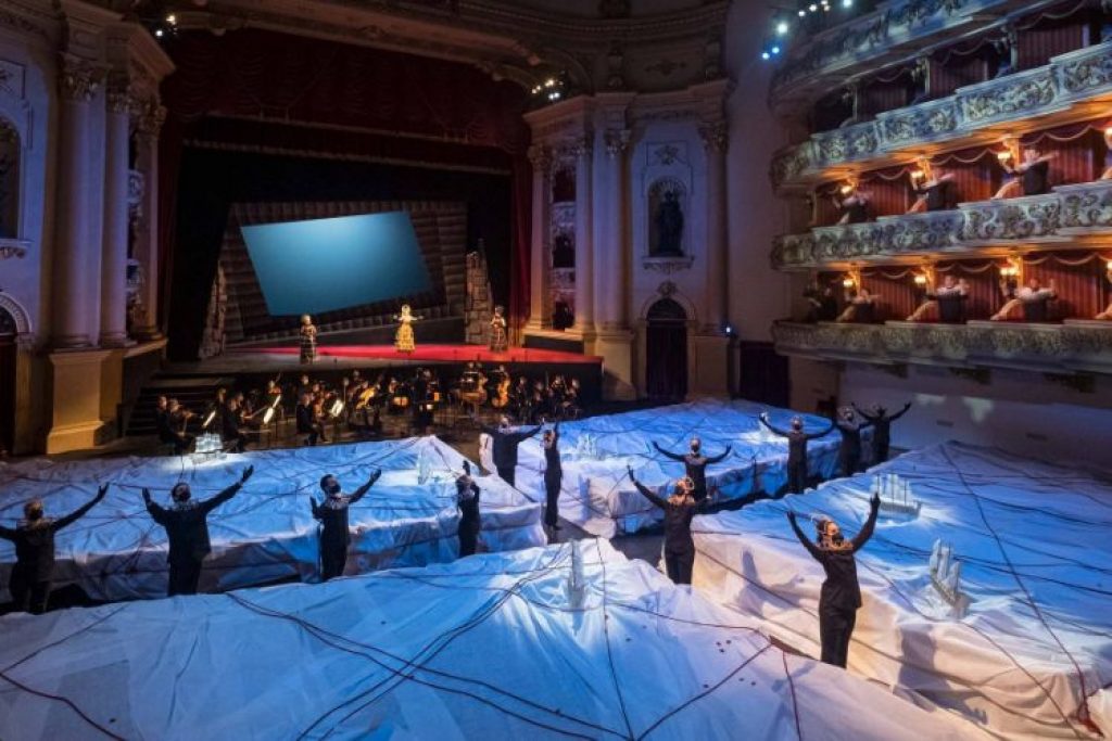 La situazione attuale ha reso indispensabile una revisione degli spazi e la platea è divenuta un prolungamento del palcoscenico, un luogo di interazione tra il coro e i solisti.