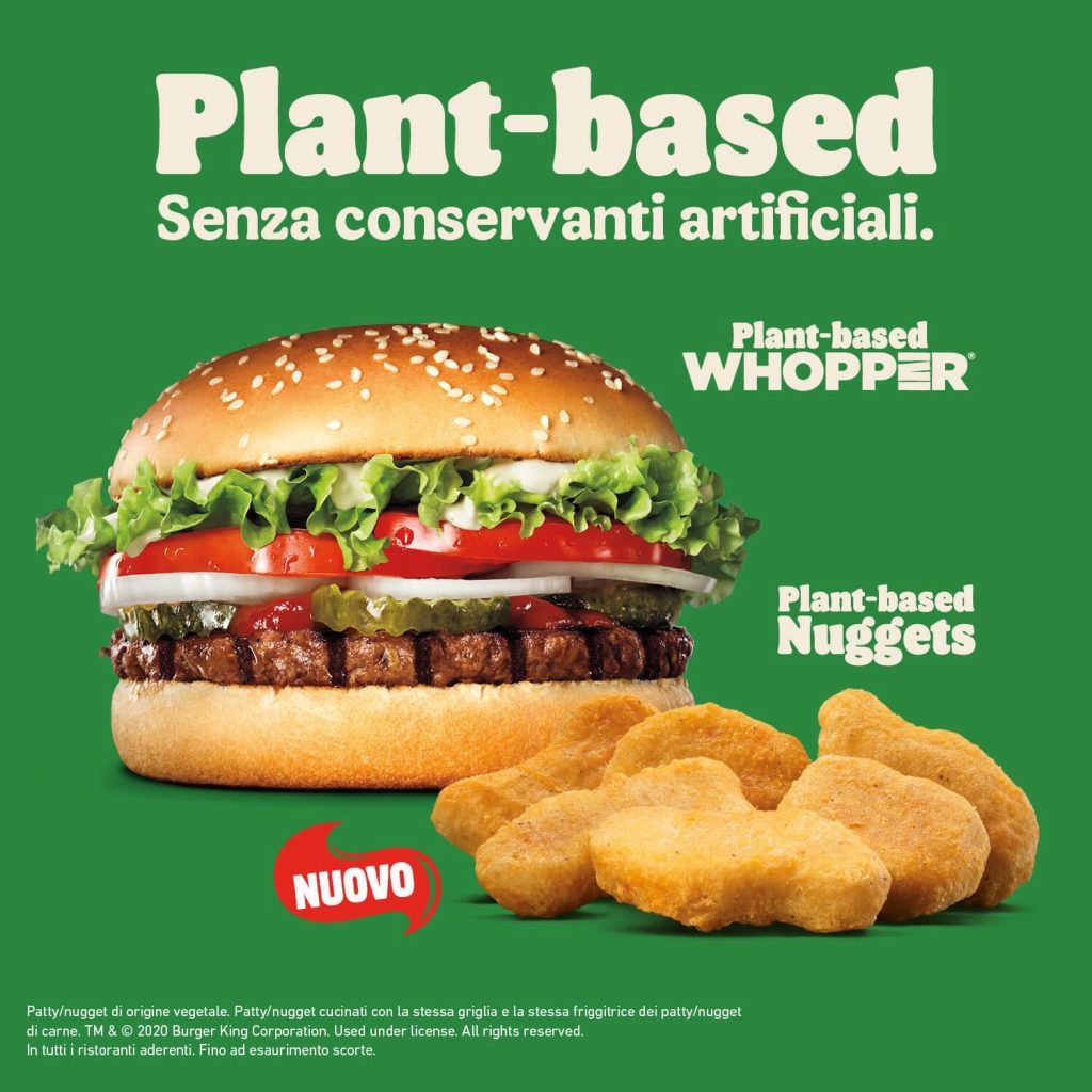 Burgher King è stata una tra le prime catene ad inserire nel proprio menù i prodotti Plant based, mentre McDonald’s ha previsto di lanciare un nuovo panino con burger di finta carne nel 2021, il McPlant, che non sarà distribuito in Italia.