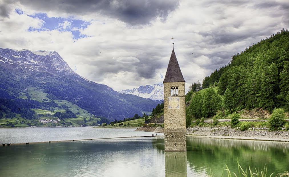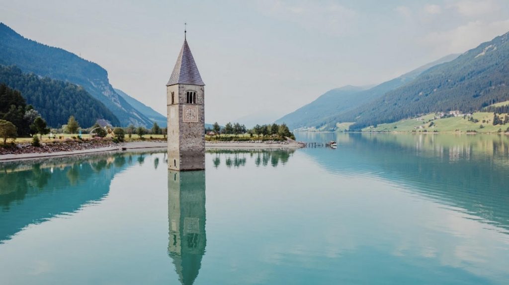 Per la sua realizzazione i circa 2000 abitanti del paese di Curon furono costretti ad andarsene e a trasferirsi lì vicino, dove il paese venne ricostruito, e il borgo, con 163 case, fu allagato e sommerso. Le popolazioni locali si opposero e chiesero aiuto anche al Papa, ma nonostante i loro sforzi nulla poté impedire la creazione di quella diga e la distruzione delle loro proprietà. L’unico edificio sopravvissuto fu l’antica Chiesa romanica di Santa Caterina d’Alessandria, risalente al 1357, di cui è visibile solo il campanile, che tutt’oggi emerge dall’acqua, regalando in tal modo uno spettacolo agli occhi e diventando una delle più grandi attrazioni della provincia di Bolzano.