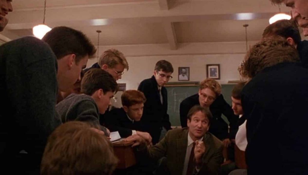 L’abilità del film di Peter Weir sta non solo nel reinterpretare in modo estremamente incalzante e attuale questa tematica, bensì nel riadattarlo al contesto dei personaggi: il professor John Keating (Robin Williams) per trasmettere i suoi messaggi usa proprio la poesia, strumento che per giunta riesce a rendere l’uomo immortale e a sconfiggere parzialmente quel tanto agognato e inevitabile destino. Sì perché è proprio a questo concetto che il film orbita durante tutta la sua durata: l’uomo, che piaccia o no, finisce per essere “cibo per i vermi”, e per quanto si possa essere fieri e potenti in vita, non si può sfuggire a questa drammatica fine. Ma è appropriato definirla “drammatica”? Che piuttosto sia ringraziata la morte, l’unica certezza che riesce a dare un senso ad una vita piena di incertezze e di punti interrogativi. Cogliere l’attimo per procrastinare e rendere degno di nota il proprio destino, ripudiando l’unico vero incubo dell’essere umano: venire dimenticati.