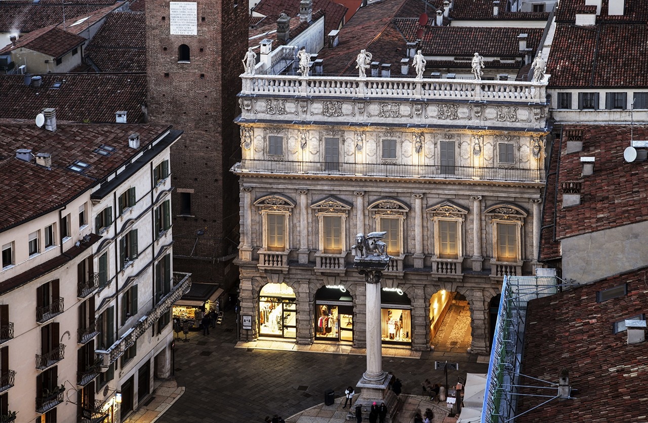 L’edificio affonda le sue radici già in epoca medioevale, ma soltanto in seguito ad un’intensa opera di restauro, avvenuta tra il 1626 e il 1668 su richiesta dei proprietari, i banchieri Marcantonio e Rolandino Maffei, è diventato il celebre palazzo di Verona che noi tutti conosciamo; si dice che i due membri della famiglia Maffei, per far approvare la richiesta di ristrutturazione, abbiano utilizzato come pretesto la necessità di migliorare il decoro della piazza. Il progetto, come si percepisce dalla splendida facciata barocca che dà sulla piazza, secondo l’affermazione di Scipione Maffei, grande erudito e riformatore veronese, fu probabilmente affidato ad un architetto romano, di cui tuttavia si ignora l’identità.