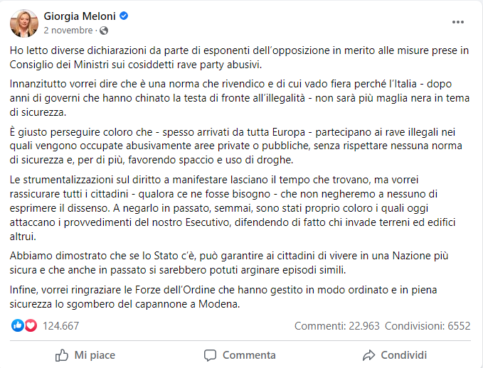 Il nuovo Governo Meloni ha cercato di bloccare questo fenomeno che ormai è praticato in tutta la nostra penisola, vietando la presenza di queste feste sia su suolo pubblico che privato, dicendo che ci sono modi più efficaci e meno distruttivi di manifestare, non togliendo quindi il diritto alla manifestazione. Secondo questa legge chiunque organizzi o partecipi ad un qualsiasi tipo di Rave party sarà perseguibile dalla legge. Questa legge è stata approvata dal Governo dopo diverse settimane e decreta una pena meno grave rispetto alla proposta fatta.