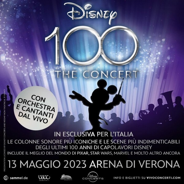 Passerà da Verona il 13 maggio la tournée europea di Disney 100, lo spettacolo promosso da Disney per celebrare il 100esimo anniversario dalla fondazione. Lo spettacolo proporrà i personaggi, le colonne sonore e le scene che hanno fatto la storia del brand.