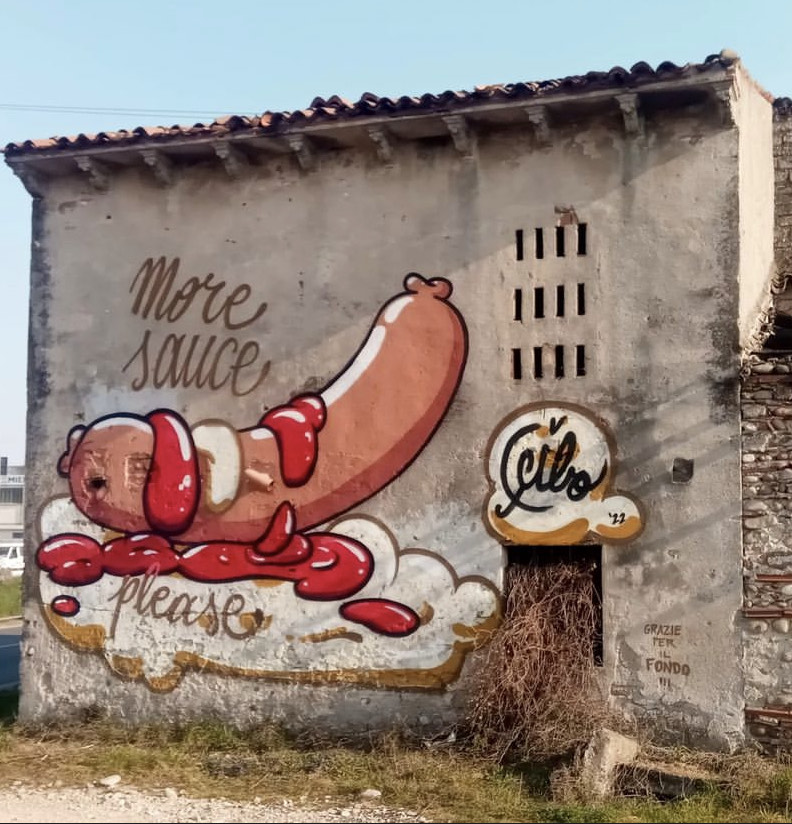 L’ho scoperto un po’ per gioco: ho cancellato una scritta fascista con una salsiccia e, ogni volta che il murales veniva rovinato, aggiungevo le salse e così ho capito che l’idea funzionava. Uso questo metodo per creare “un dialogo” sui muri con i neofascisti, ma è anche un modo di comunicare con coloro che passano per la strada e vedono ciò che avviene. Si tratta di deridere le persone ignoranti che sono convinte di essere dei duri, ma in realtà non lo sono e molte volte non sanno rispondere: le mie armi sono la cultura e la bellezza.