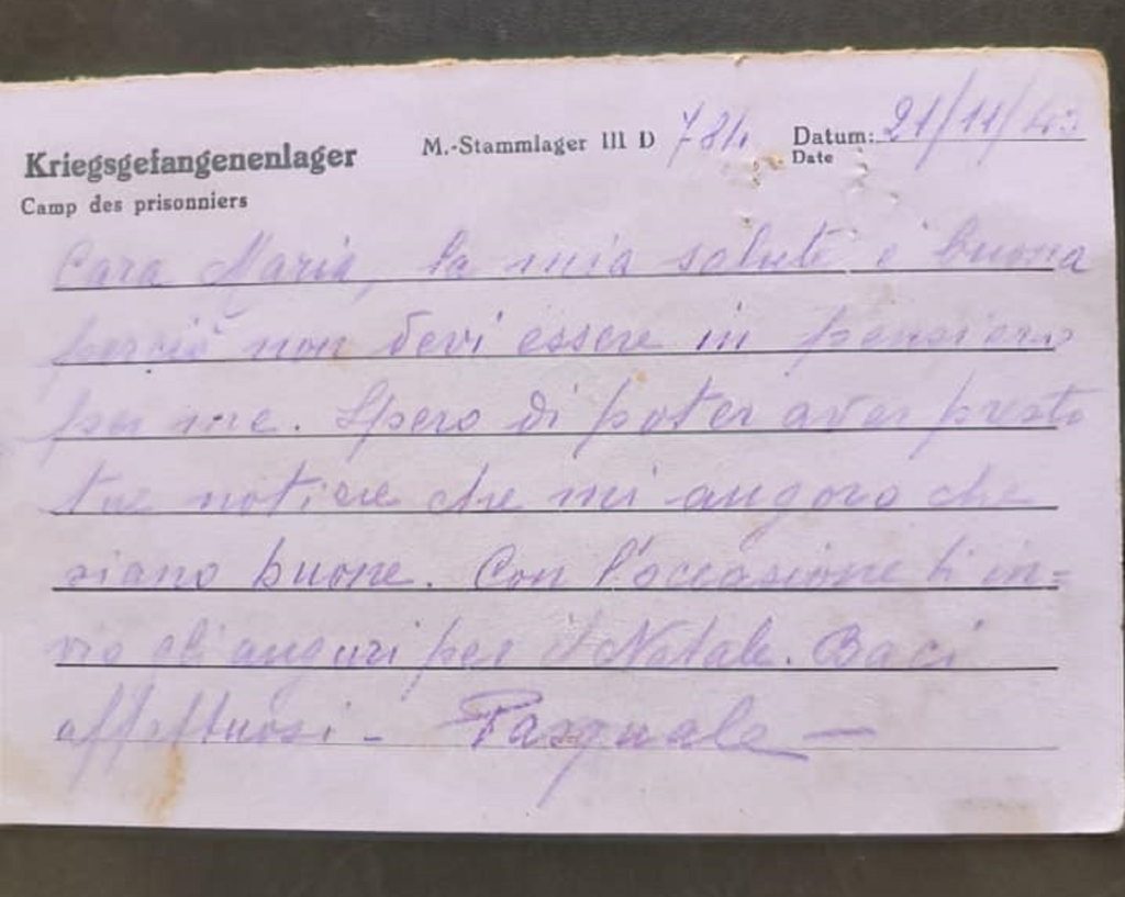 Nel novembre del 1943 il soldato Pasquale Aloisio scrisse a sua moglie da un campo di prigionia nei pressi di Berlino, ma la lettera non giunse mai a destinazione.