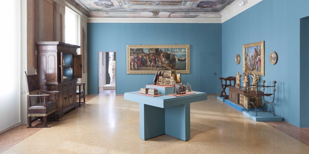 Nella prima parte del percorso espositivo, connotato dagli affacci su Piazza delle Erbe, si privilegia il dialogo con gli ambienti del Piano Nobile del Palazzo a ricreare l’atmosfera di una dimora privata, ma anche il senso di una sintesi tra le arti, con nuclei tematici d’arte antica in cui entra all’improvviso il dialogo con la modernità.