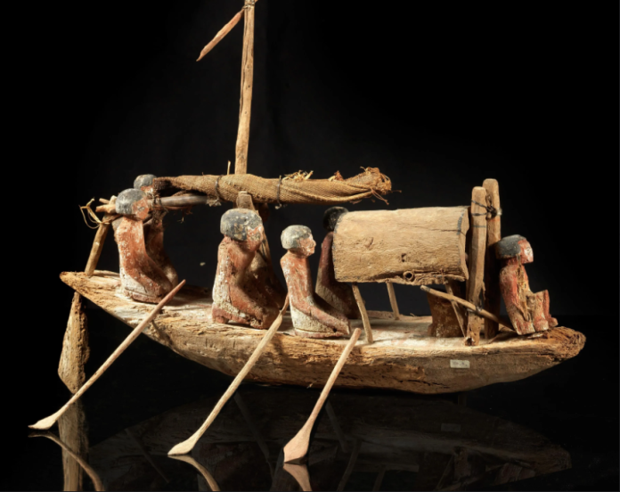 Databile tra il 1939-1850 a.C. l’imbarcazione, lunga 50 cm, appartiene a un gruppo di modellini prodotti soprattutto nel periodo del Medio Regno. Sotto la struttura mobile coperta (la cabina), si scorge il corpo del defunto circondato da sei rematori inginocchiati che simulano il movimento della remata, mentre a poppa vi è il timoniere. Completo di tutte le sue parti primarie, in legno modellato e intagliato con tracce di policromia, il reperto esposto nel museo sullo scafo presenta decorazioni lineari bianche e brune, e fori di innesto per il fissaggio dei vari elementi mobili e dei personaggi. L’albero maestro è disposto centralmente ed è dotato di vela arrotolata che poggia orizzontalmente su un ulteriore supporto mobile. Il tutto per rendere “funzionante” l’imbarcazione anche nell’aldilà, affinché il defunto potesse essere condotto con sicurezza a destinazione.