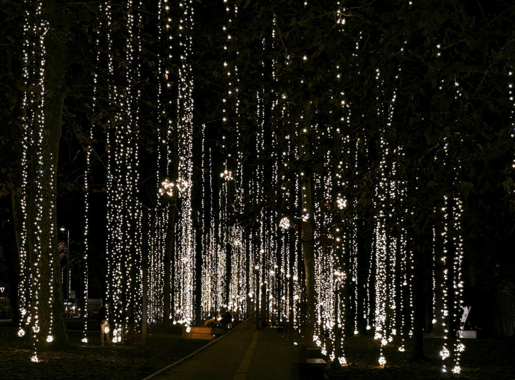 Gli alberi di Peschiera, invece, vengono decorati con liane luminose che cadono sfiorando il terreno, dando la sensazione di trovarsi in un vero e proprio bosco incantato, tanto fitto e affascinante da sembrare quasi impossibile non perdersi al suo interno.