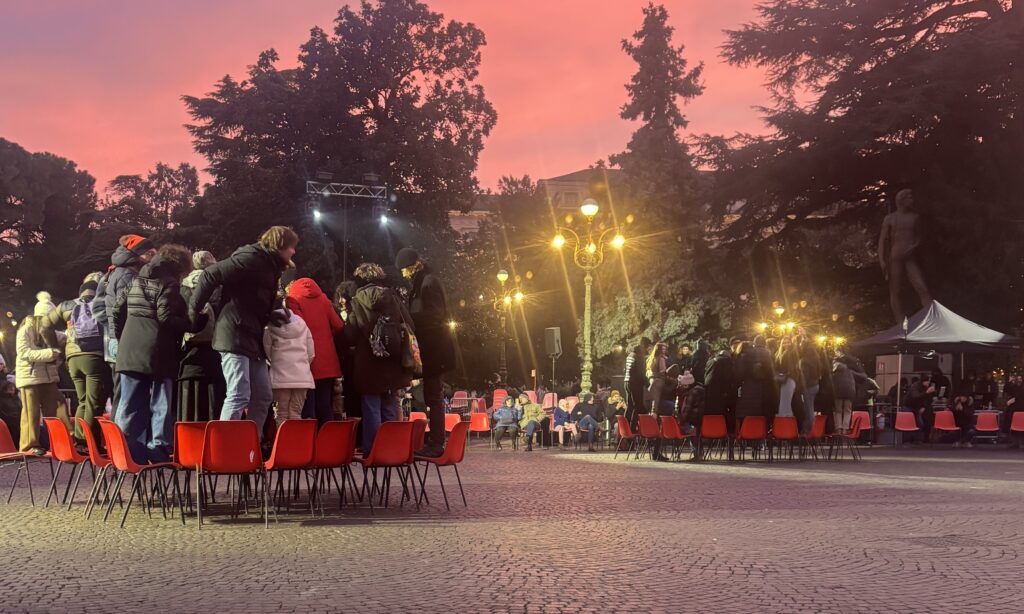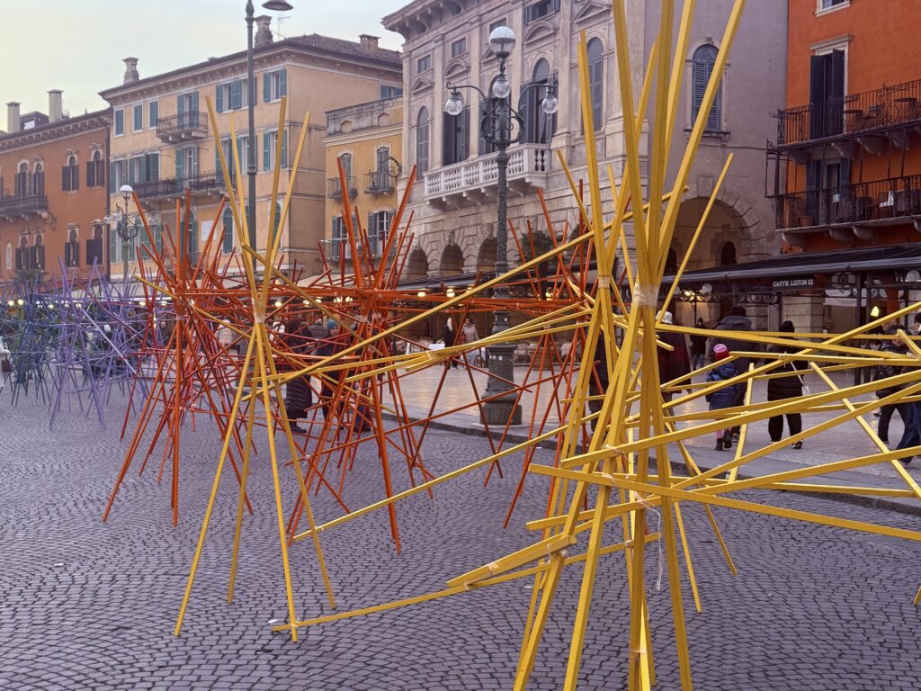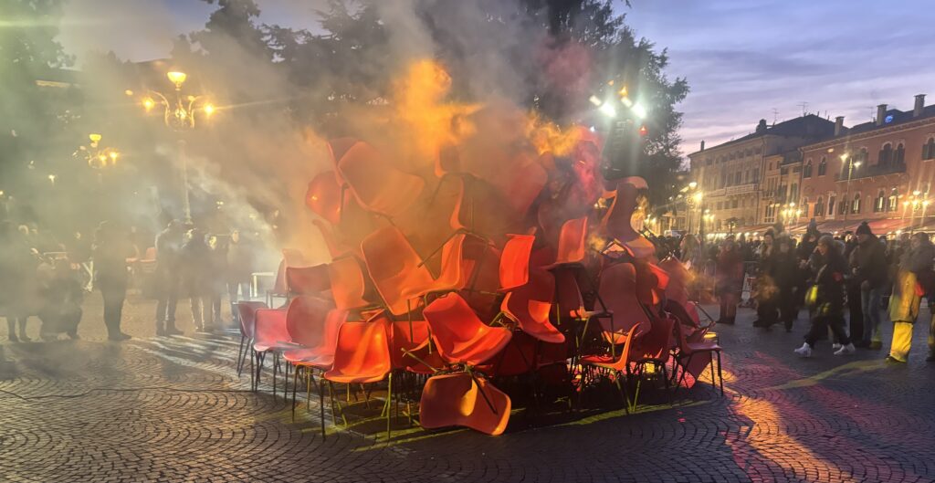 Il momento clou è avvenuto nel pomeriggio nella piazza scaligera, quando la tradizione è stata rivisitata attraverso la creazione di un grande spazio scenico dall’atmosfera onirica e fiabesca, in cui artisti e pubblico si sono incontrati realizzando un’installazione fatta di steli e una performance costruita con delle semplici sedie di plastica rossa. La performance è stata offerta dalla compagnia teatrale torinese Stalker, riconosciuta a livello nazionale per le avanguardistiche rappresentazioni teatrali itineranti. La compagnia ha regalato a veronesi e turisti un momento di condivisione proprio in un periodo storico in cui la socialità si sta sempre più affievolendo e sostituendo con il digitale. Infatti l’installazione “Steli” è stata realizzata proprio dal pubblico seguendo le indicazioni e i movimenti degli attori.