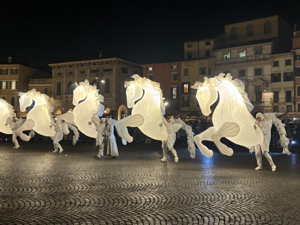 La celebrazione è terminata con “Fiers à Cheval” della compagnia francese Quidams; una sfilata di attori travestiti da cavalli alti quattro metri e illuminati che hanno guidato il pubblico in un percorso onirico di movimenti e danze all’interno di piazza Bra e via Mazzini.  Ed è stato affidato proprio a questi cavalli il simbolo di messaggeri di buon auspicio per il nuovo anno.