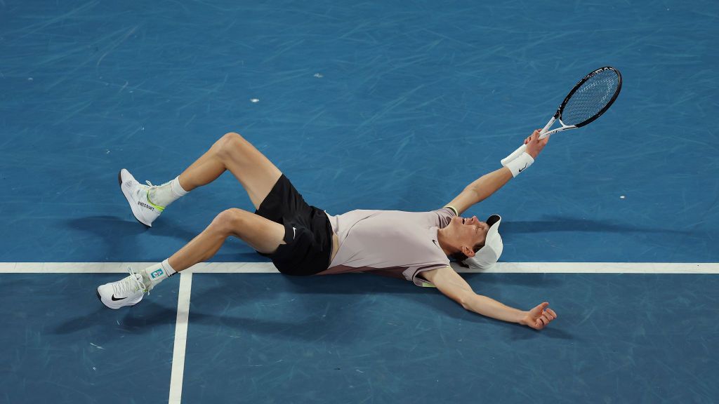 Jannik Sinner esulta dopo la vittoria agli Austrialian open avvenuti nel 28 gennaio 2024